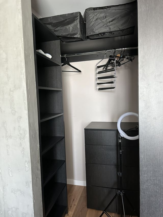 Є шафа для одягу, чиста постільна білизна та додаткові комплекти ковдр і подушок.