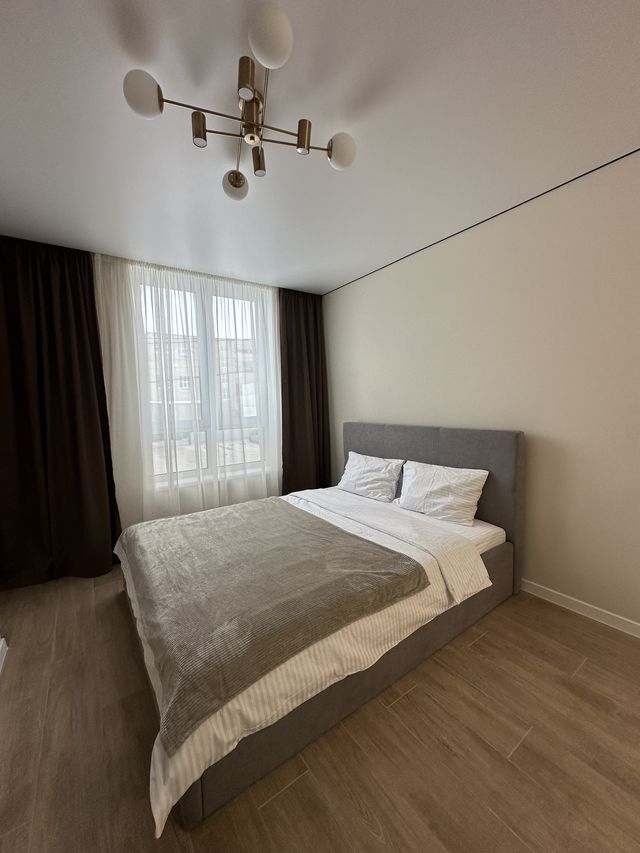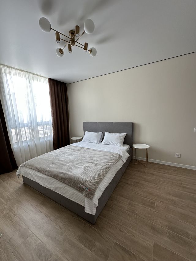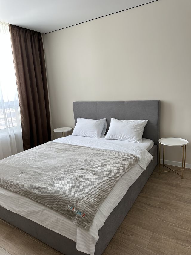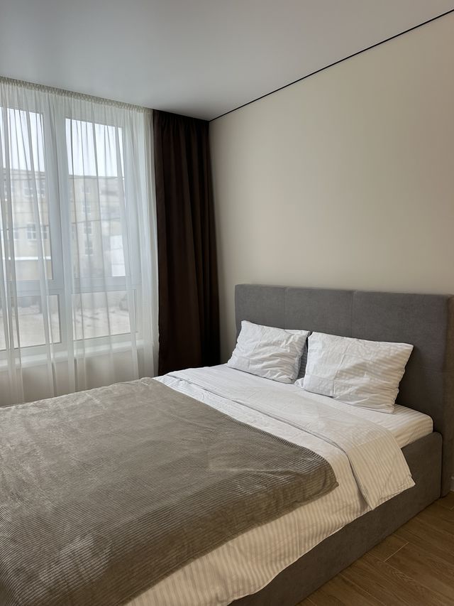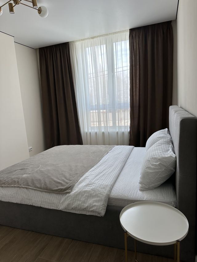 Панорамні вікна наповнюють квартиру природним світлом, а щільні штори забезпечують комфортний відпочинок. Санвузол сучасний та чистий. У помешканні є швидкісний Wi-Fi, зручні меблі та вся необхідна побутова техніка.